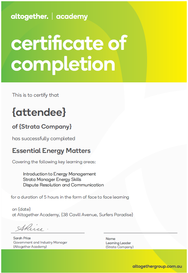 "Advanced Energy Matters" is the second course in a series designed to equip strata managers with the advanced energy knowledge necessary to manage communities with complex energy needs. Tailored for experienced strata managers or those looking to expand their expertise, this course delves deeper into the intricacies of energy management in strata properties.